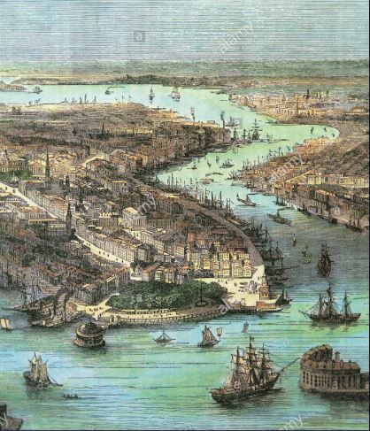The ship, the Jorne Langelaan, named after the builder of the first of the post carbon Eco-Clippers, has its crew aloft putting a harbor furl on the hemp cloth sails. She carries a mixed cargo of Caribbean fair trade coffee and cocoa beans bound for the region’s roasters and chocolatiers as well as preserved tropical fruits and rum. The Langelaan is looking a little “worse for wear” having skirted the 5th named Atlantic storm of the season. But her New York trained crew of young men and women is in good spirits, looking forward to spending time ashore, and to a few drinks of brew, cider, and spirits locally made and delivered by sloop and schooner from around the region, and to a good meal at a cafe serving up dishes harvested from the Harbor’s new artisan fishery and from oyster beds in shallows created by submerged piers and streets.