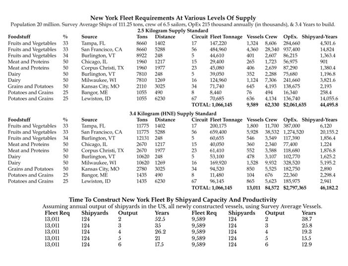 The first step in such a process is establishing a level of supply needed in a given city, which in our case with be the New York Metro Area. To survive, the city must have 2.5 kilograms of food per person daily. With a population of some 20,000,000 people, the New York Metro Area needs 50,000 metric tons of food per day, at a minimum, to prevent starvation. This gives us our daily requirement but does not give the full picture. A representative model of the NYMA Foodshed must be established, and the travel times from the food’s origin to destination must be calculated, alongside time for loading and unloading, as well as time for the ship to return to the origin for its next cargo.