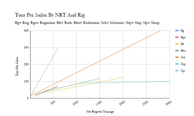 In the case of Sail Freight, fuel or energy efficiency is not applicable in the same way as with conventional transportation. The appropriate metric of efficiency is “Tons Per Sailor” as the major cost is labor. The higher the tons per sailor, the lower the cost of moving cargo becomes, and the large the vessel, the greater the tons per sailor. Further, this metric is effected by rig, as seen below.
