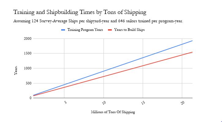 Of course, ships without trained crews are useless. The time to train windjammer sailors must also be considered. With an average program able to train around 650 sailors in a given year, the number of training program years needed to train the NYMA fleet’s crew requirement would be some 100 years, though with 8 such programs running concurrently this could also be accomplished in less than 15 years. The chart below shows the relationship between training program years and shipyard years and demonstrates that training a sufficient number of sailors will likely take longer than the construction of a sufficient number of vessels for the mission at hand.